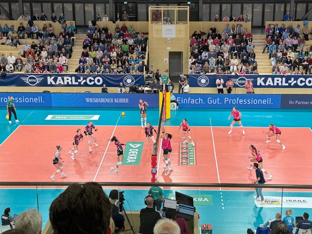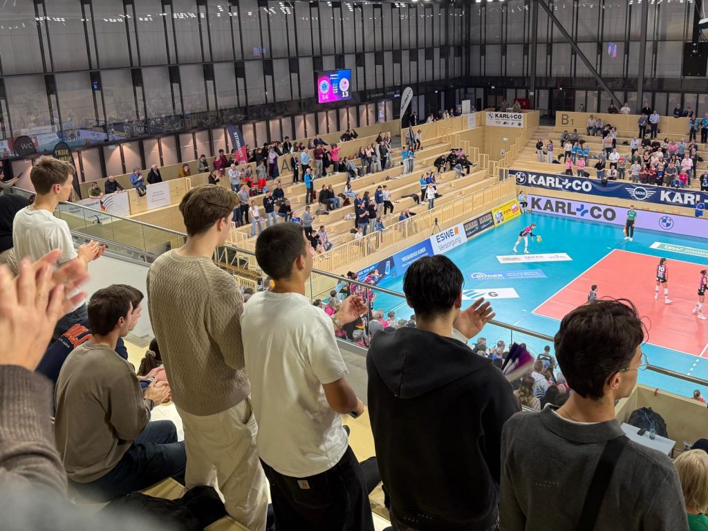 Am 28.10.2025 nutzte der Q3-Sportkurs die Gelegenheit, sich ein Spiel der 1. Volleyballbundesliga der Damen des VC Wiesbaden anzusehen. Gemeinsam mit rund 1000 anderen Zuschauern erlebten die Schüler und Schülerinnen eine spannende und stimmungsvolle Partie, die am Ende mit 3:2 Gewinnsätzen vom heimischen VCW gewonnen wurde. Es ging aber nicht nur darum, sich ein solches Spiel anzusehen, sondern auch etwas daraus zu lernen. Schnell wurde deutlich, dass im professionellen Volleyballspiel deutlich mehr Geschwindigkeit und Dynamik vorhanden sind als bei den Spielen, die in der Schule stattfinden. Mithilfe eines Arbeitsblattes hielten die Schüler und Schülerinnen ihre Beobachtung zur Aufstellung, zum Spielsystem, zu Positionen und Kommunikationen im Team fest.