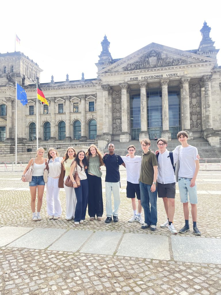 Ein weiteres Highlight der Fahrt war der Besuch im Deutschen Bundestag mit dem Gespräch des MdB Stefan Korbach aus Wiesbaden. Die Schülerinnen und Schüler waren nicht nur neugierig, den Deutschen Bundestag von innen sehen zu können, sondern auch Fragen an den Bundestagsabgeordneten und seine Mitarbeiterin richten zu können. Es war auch spannend, die Bundestagsabgeordneten aus der Nähe zu sehen, z. B. Jens Spahn, der kurz in „unseren Sitzungssaal“ hineinschaute, oder Carsten Linnemann, der uns im Vorbeigehen grüßte, sowie Felix Banaszak, dessen Kind samt Kinderwagen vor dem Plenarsaal dabei war. Viele weitere Abgeordnete erkannten wir und beobachteten interessiert, wer mit wem im Gespräch war.