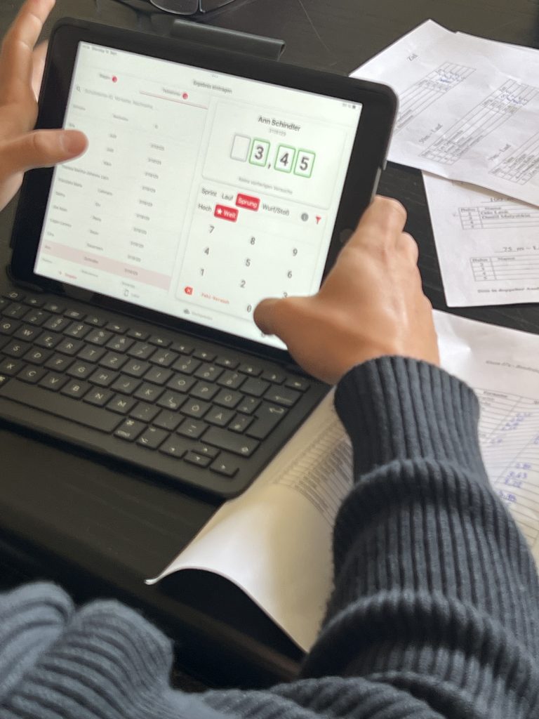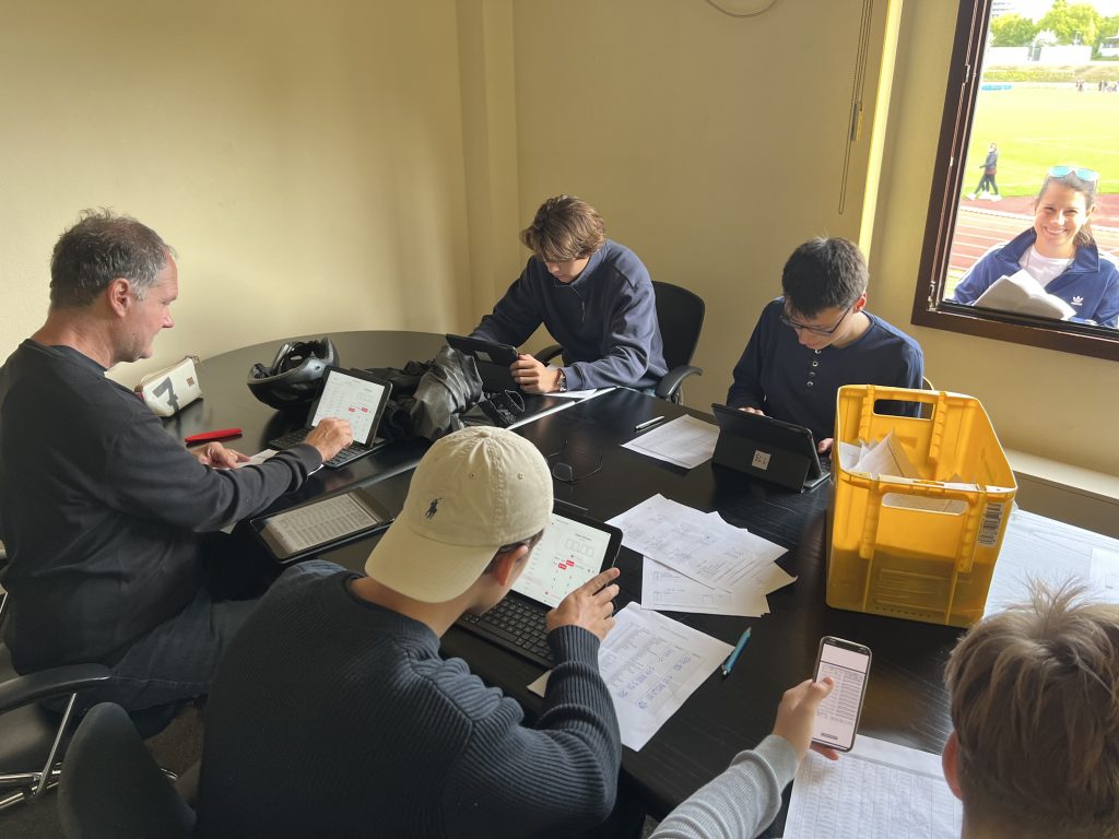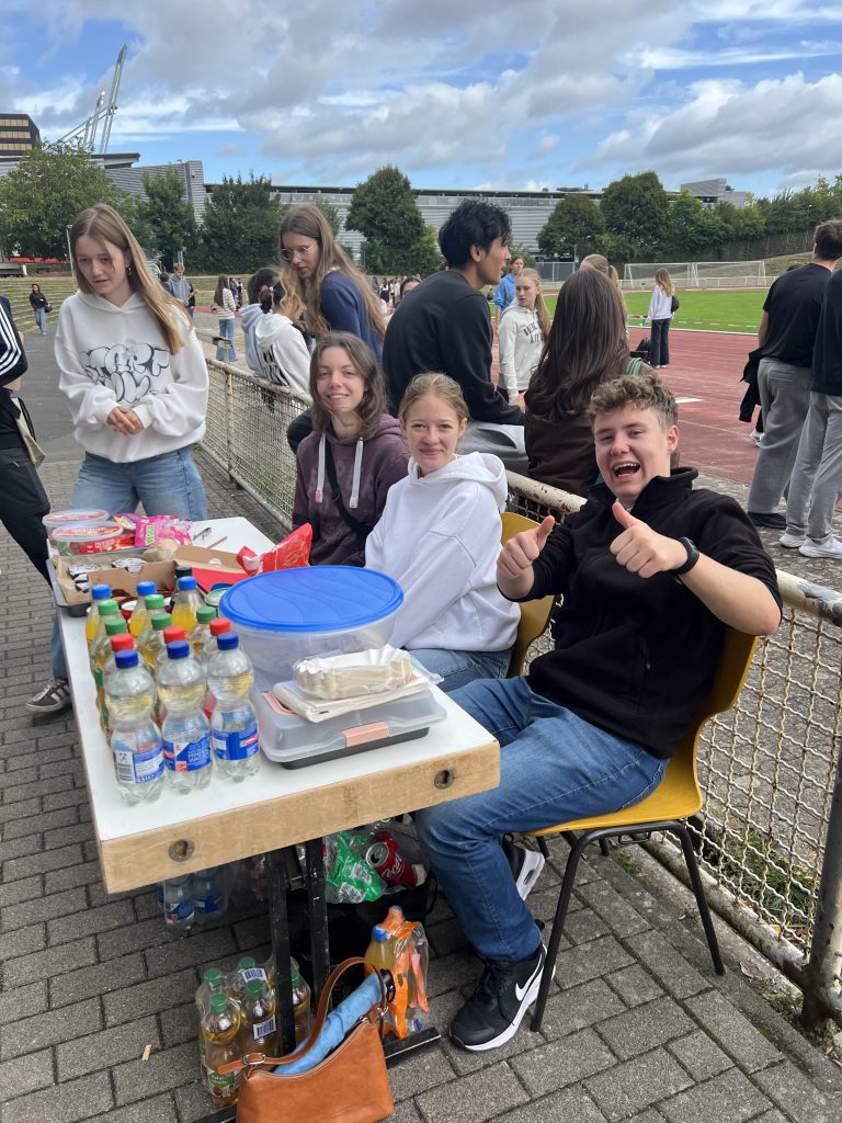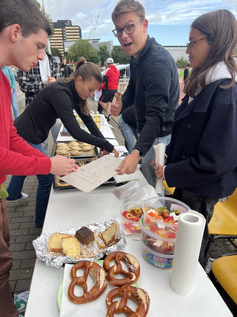Zwischen den einzelnen Wettkämpfen konnte im Bühnenbereich „gesnackt“ werden. Wer nicht genug dabei hatte, wurde an den Verkaufsständen der Oberstufe fündig (der Kuchen war sehr lecker). Während die einen „sportelten oder snackten“, gaben die Helfer und Helferinnen im Rechenzentrum auch alles. Zwar machten sie nicht den Eindruck, dass sie sich körperlich völlig verausgabten, aber dafür mussten sie ja auch schließlich sehr konzentriert alle Wettkampfergebnisse der einzelnen Riegen in die Rechner eingeben (jeder Punkt zählt!). Vielen Dank dafür!