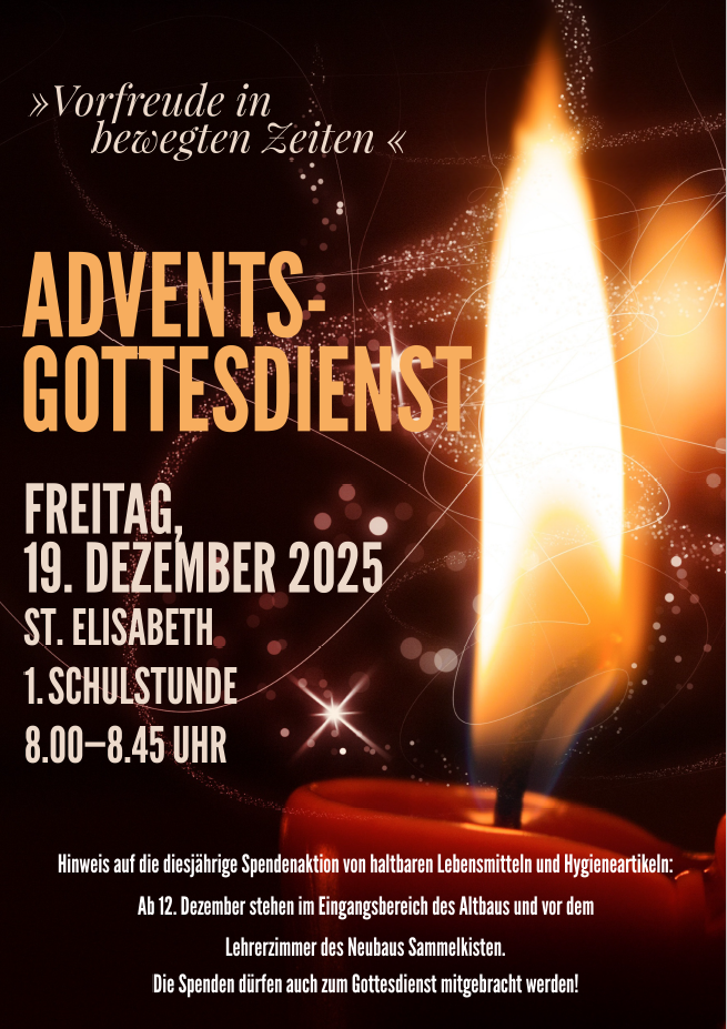 auch in diesem Jahr möchten wir die letzte Schulwoche mit unserem ökumenischen Adventsgottesdienst beschließen. Unter dem Motto „Vorfreude in bewegten Zeiten“ haben wir noch einmal die Gelegenheit, uns gemeinsam auf das Weihnachtsfest einzustimmen.