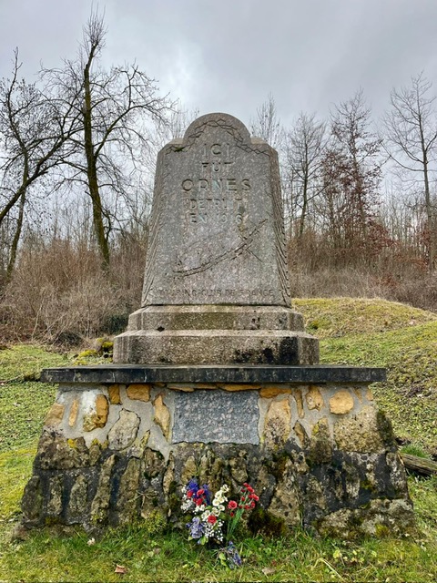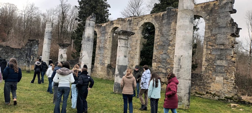 Besonders eindrucksvoll war auch der Besuch des zerstörten Dorfes Ornes, eines der neun im Ersten Weltkrieg vollständig zerstörten Dörfer, die nicht wiederaufgebaut wurden und den Ehrentitel „Mort pour la France“ (Gestorben für Frankeich) tragen. Bis heute existiert in diesen Dörfern formal eine Gemeinde mit einem Bürgermeister, der nicht gewählt, sondern staatlich ernannt wird. In Ornes ist dies Herr Saint-Vanne, der uns durch „sein Dorf“ führte und uns die einzig erhaltene Ruine der Kirche zeigte. Abschließend lud er uns herzlich zu selbst gepresstem Apfelsaft ein.