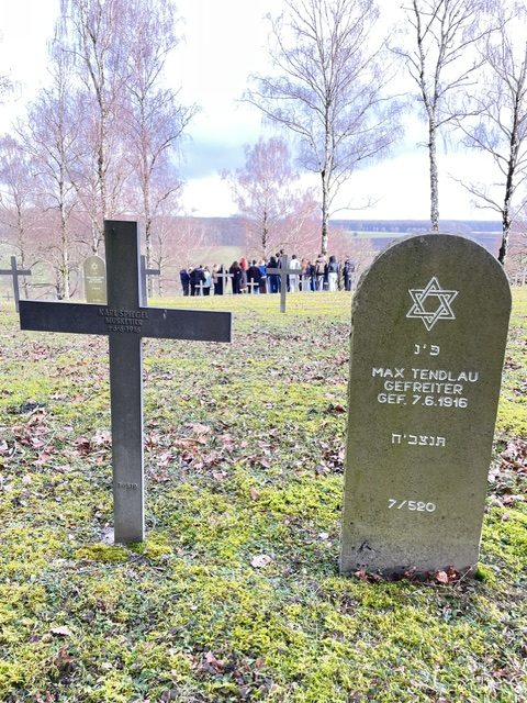 Vor Ort wurden wir von unserem Guide Pierre Lenhard begleitet, der uns mit großer Fachkenntnis und viel Engagement zu den verschiedenen Schlachtfeldern, Gedenkstätten und Denkmälern führte. Zu den Stationen der Exkursion gehörten unter anderem der Bois des Caures (Haselnusswald), das Fort Douaumont, das Beinhaus von Douaumont sowie der deutsche Soldatenfriedhof Azannes II. Sowohl im Caures-Wald als auch in Azannes II machte Pierre uns aufmerksam auf Bezüge zu Hessen, ja sogar zu Wiesbaden. Er ließ uns zum Beispiel zwei Soldatengräber von Wiesbadenern suchen: Peter Meurer war Angehöriger des Kurhessischen Füsilier-Regiments „von Gersdorff“, dessen Infanterie-Regimenter in der Region um Wiesbaden rekrutierten und die schwere Verluste bei Verdun erlitten. Max Tendlau gehört zu den etwa 100.000 jüdischen Soldaten, die für das Deutsche Kaiserreich kämpften und deren religiöse Identität gewahrt blieb, indem sie Grabstelen aus Naturstein erhielten. Während Wilhelm II. die jüdischen Kämpfer noch als „deutsche Brüder“ bezeichnete („Ich kenne keine Konfessionen mehr“), wurden Juden ab 1933 systematisch entrechtet, verfolgt und ermordet.