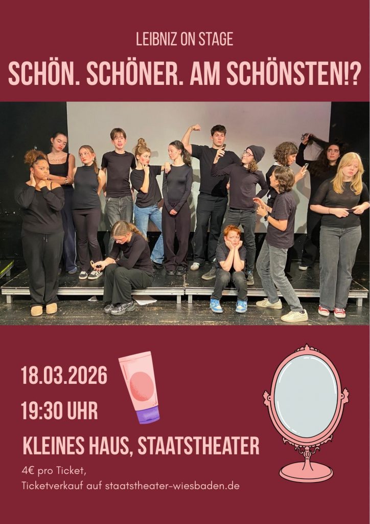 Die Theatergruppe der Leibnizschule lädt die ganze Schulgemeinde und alle Interessierten ganz herzlich zur diesjährigen Theateraufführung der Eigenproduktion Schön. Schöner. Am schönsten!? am 18. und 20.3. ein.