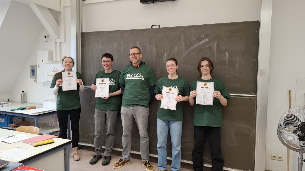 Am 13. Januar 2026 nahmen wir, Ben-Mikko, David, Maja und Minka (Q1), am Internationalen Mathematik Teamwettbewerb Bolyai teil. Der Wettbewerb bestand aus 14 mathematischen Knobelaufgaben, die wir innerhalb von einer Stunde lösen mussten. Dabei erreichten wir hessenweit den ersten Platz. Das internationale Finale in Budapest verpassten wir um lediglich sieben Punkte und erzielten in Deutschland so leider nur den (inoffiziellen) zweiten Platz. Dennoch empfanden wir die Teilnahme als bereichernd und wollen auch nächstes Jahr wieder teilnehmen.