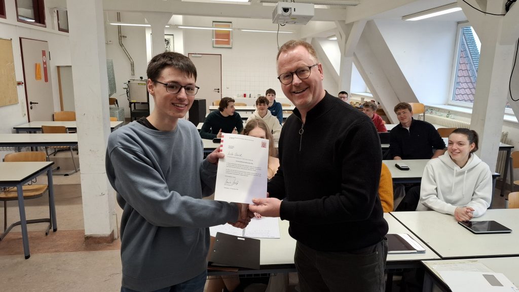 Wir gratulieren David Koufen, Q1, zu seinem großartigen Erfolg beim Bundeswettbewerb Mathematik! David hat es geschafft, die zweite Runde des Wettbewerbs zu gewinnen und sich damit für das abschließende Kolloquium im Februar 2026 qualifiziert.