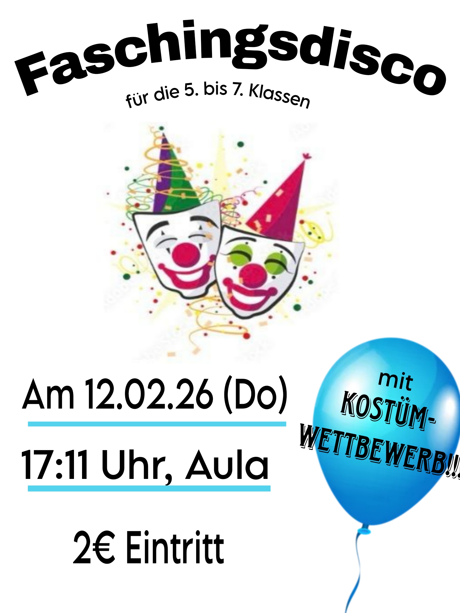 Am Donnerstag, dem 12.02.2026, bekannt auch als ‚Weiberfastnacht‘, findet (für Narren jeglichen Geschlechts) ab 17:11 Uhr die traditionsreiche Faschingsdisco in der Aula statt.
